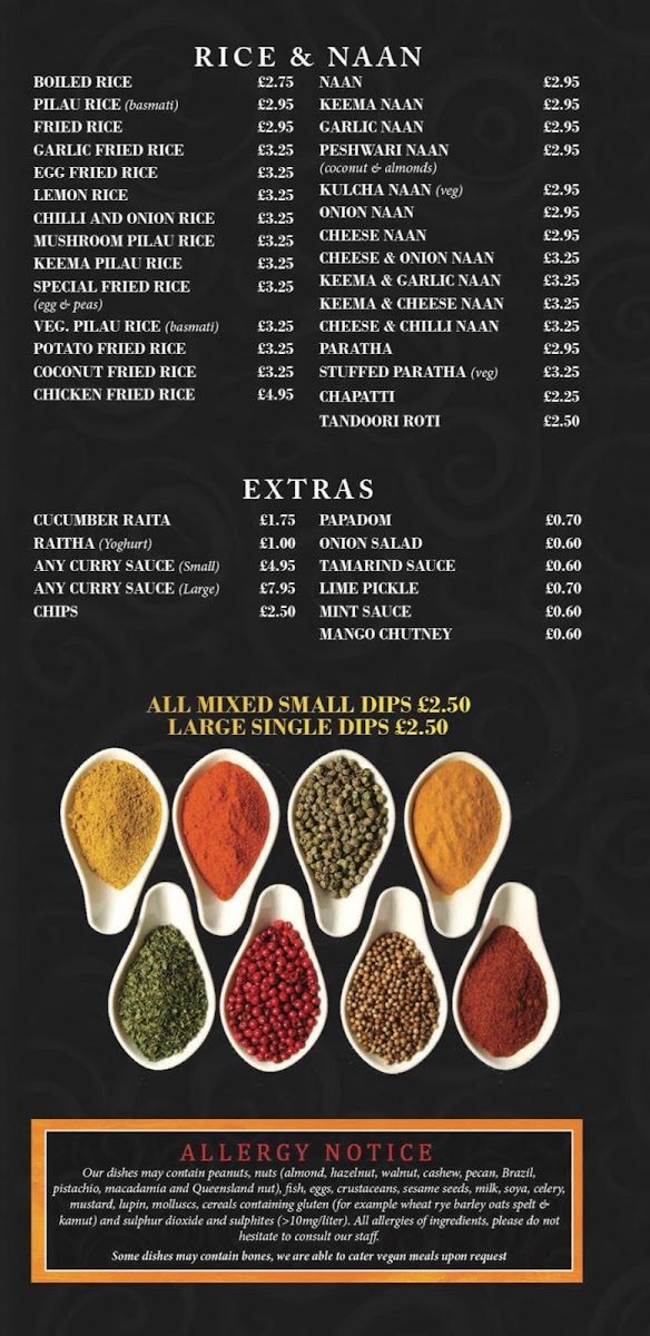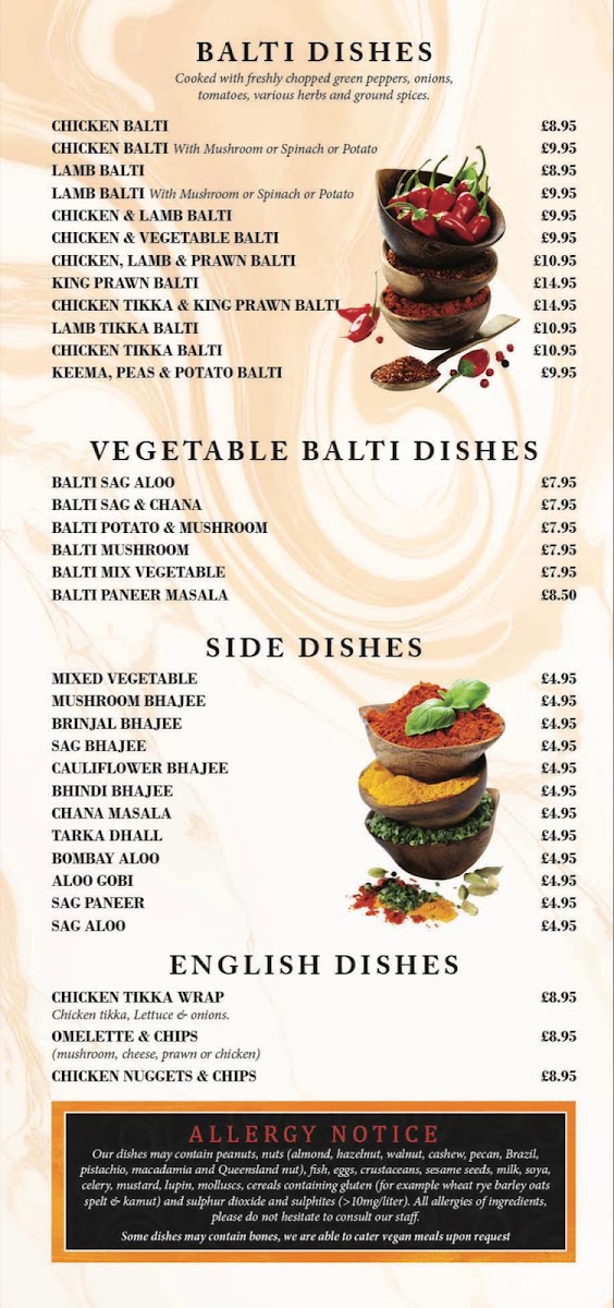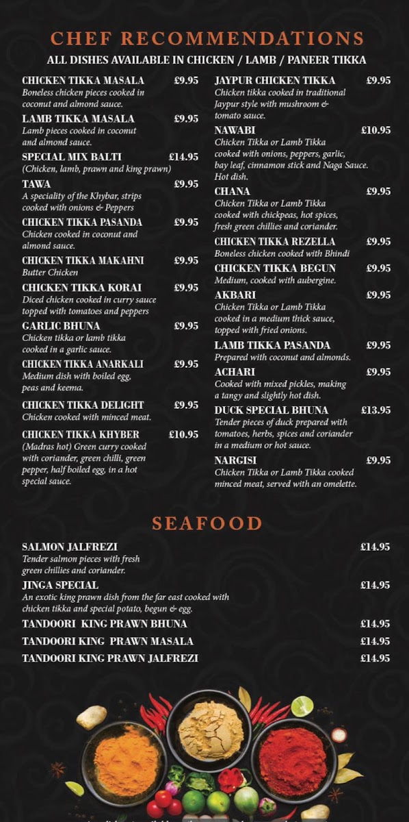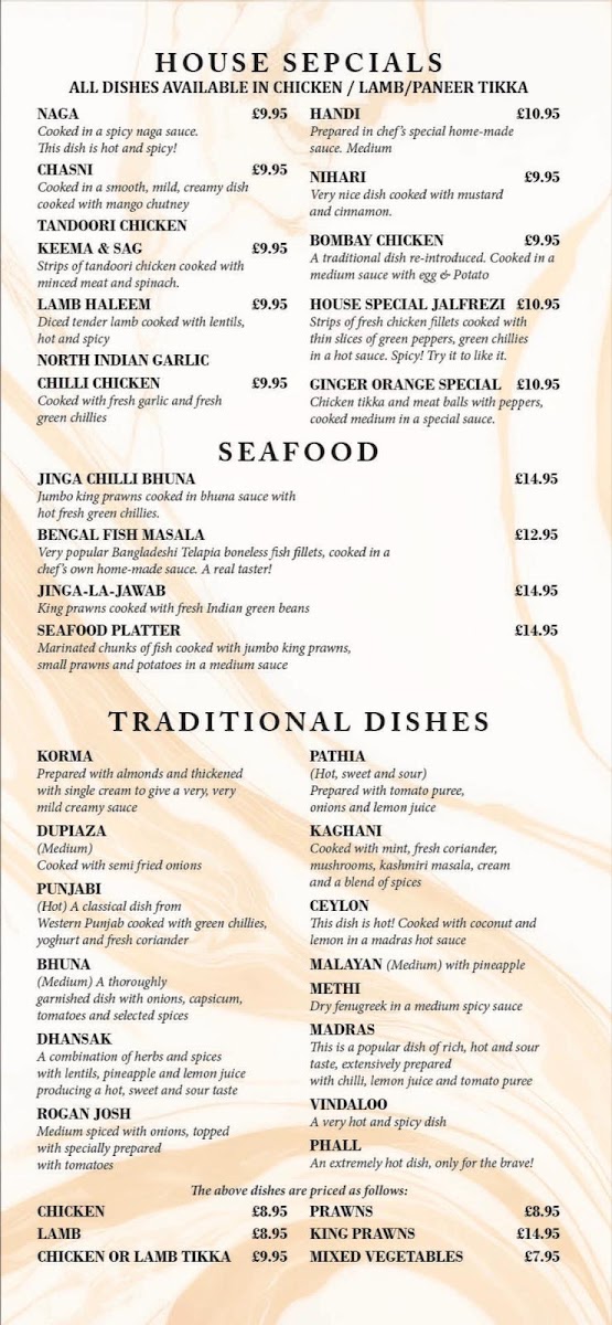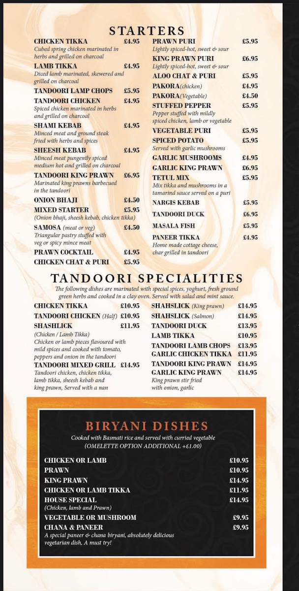 The menu at Ginger Orange offers a diverse selection of dishes that cater to various tastes, making it a standout choice for anyone craving authentic Indian cuisine. For starters, you can choose from Chicken Tikka, Prawn Puri, and Lamb Tikka, with prices not listed but likely reflecting standard starter pricing. The Tandoori Specialities section features highlights like Tandoori Chicken Shashlick and Tandoori Duck, offering a smoky, grilled flavor. If you're a fan of biryanis, the Chicken or Lamb Biryani and the King Prawn Biryani are must-tries. Chef Recommendations include classic favorites such as Chicken Tikka Masala and the slightly spicier Jaypur Chicken Tikka. For seafood lovers, the Salmon Jalfrezi and the multiple varieties of Tandoori King Prawn, such as Tandoori King Prawn Masala, are excellent choices. The Balti dishes come in a variety of combinations, with the Chicken & Lamb Balti and the Chicken, Lamb & Prawn Balti being particularly popular. Vegetarians will enjoy the Balti Mix Vegetable and Balti Mushroom, while sides like Mushroom Bhajee and Sag Bhajee complement the main courses. If you're in the mood for something more casual, the Chicken Tikka Wrap or Omelette & Chips are simple but satisfying options. To round off the meal, the restaurant offers a range of rice options, from Boiled Rice to Pilau Rice, and naan varieties like Keema Naan. For a bit of added flavor, you can add Cucumber Raita or Onion Salad. Ginger Orange also features a collection of house specials like the spicy Naga and comforting Lamb Haleem. Overall, this menu presents a blend of traditional favorites and unique offerings that cater to a wide variety of tastes, ensuring there’s something for everyone to enjoy.